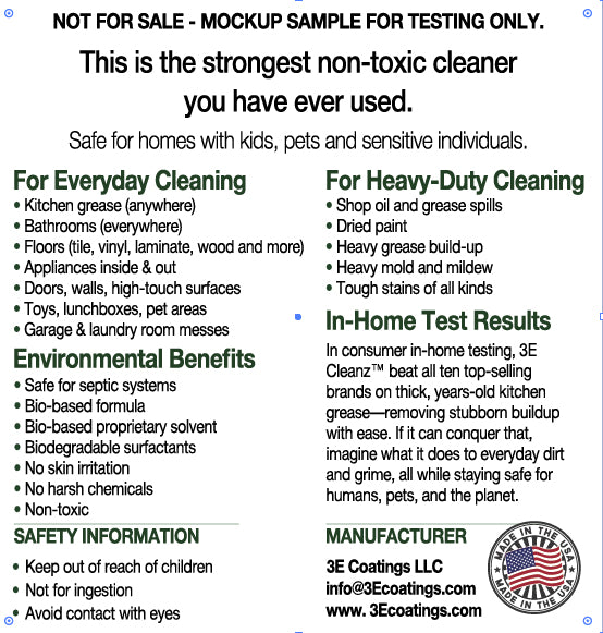 We will soon be launching a consumer product test and offering a free sample bottle to the first 50 participants who sign up. Selected participants will receive a complimentary sample and be asked to complete a brief online survey about their experience. Your name and contact information will remain confidential and will not be published. If youβre interested in trying this truly eco-bio-friendly, high-performance cleaning product, email us at testing@3Ecoatings.com to be added to the list.