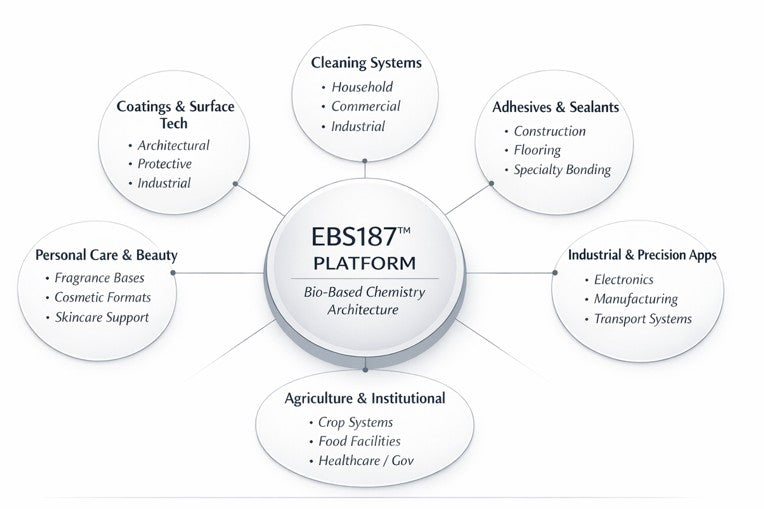 EBS187β’ is a proprietary bio-based chemistry architecture enabling high-performance cleaning formulations with materially improved safety characteristics. Initial commercialization focused on cleaning applications, with disciplined expansion into adjacent high-value sectors.